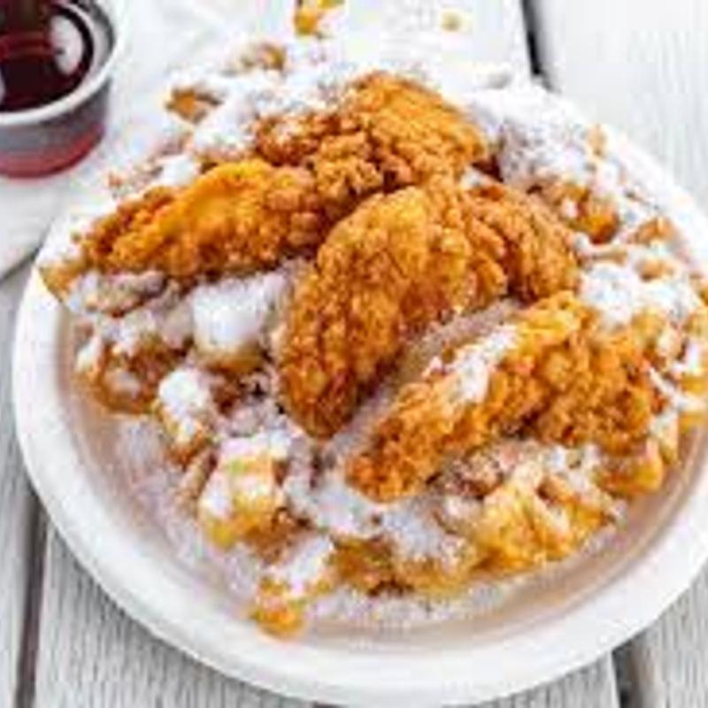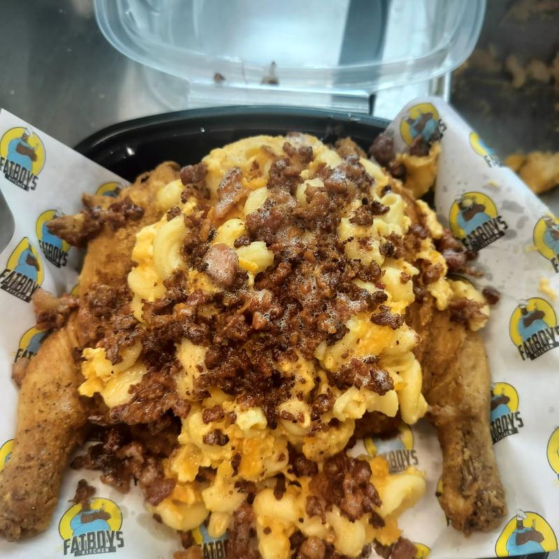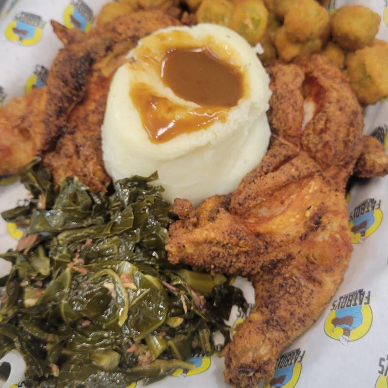 Deep fried hen, stuffed with mac & cheese, collard greens and yams